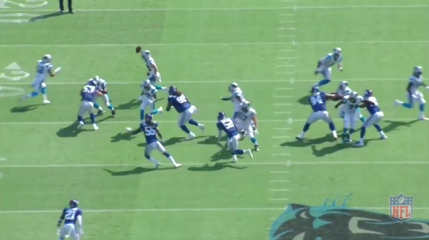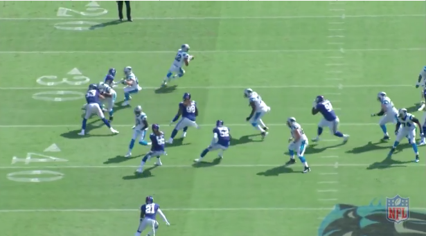 Is this awful tackling on the Giants’ part? You can bet that, but Moore is also difficult to bring down and picked up a lot of yards after contact on this play. His pad level and balance are parts of the reason why the Panthers made him the 24th overall draft pick.