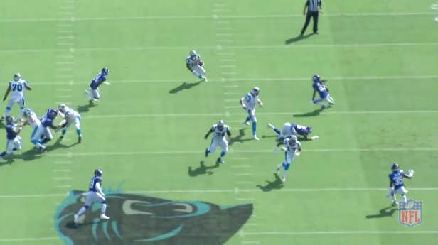 Rookie tight end Ian Thomas is pulled from the strong side of the formation after the snap to create further misdirection and space for Moore. What ultimately gives Moore space beyond the line of scrimmage is Cam Newton’s devastating block on defensive end Kareem Martin, pulverizing him to the turf; the Panthers offensive line that has seen so many changes provides excellent blocking in space, most notably center Ryan Kalil who helps clear the middle of the field.