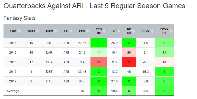 They can’t really stop the pass either, and it’s all added up to 34.2 DK fantasy points per game to opposing QBs so far, the second-worst mark in the league. Going back to last year, Arizona has allowed a top-three QB fantasy scorer in three of their past five games.