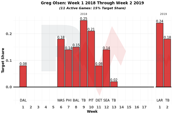 That last stat is for anyone considering playing Olsen in DFS this weekend — the Cardinals have been thrashed for 2.7 fantasy point per target season. Only the tanking Dolphins are worse.