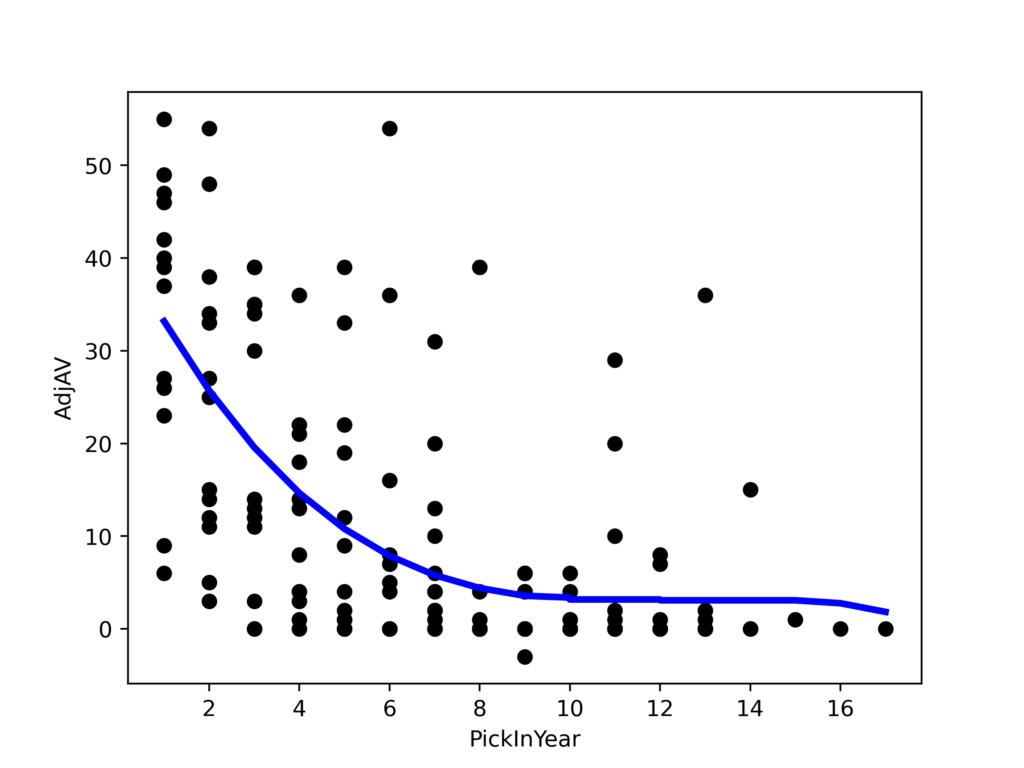 Firstly, let’s look at how AdjAV depends on where a quarterback is selected, which has been fitted to indicate a general trend:
