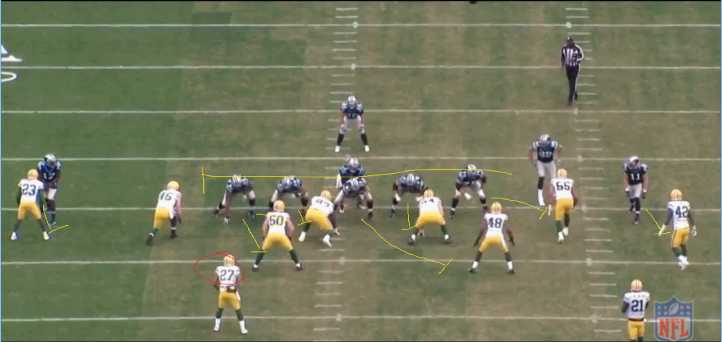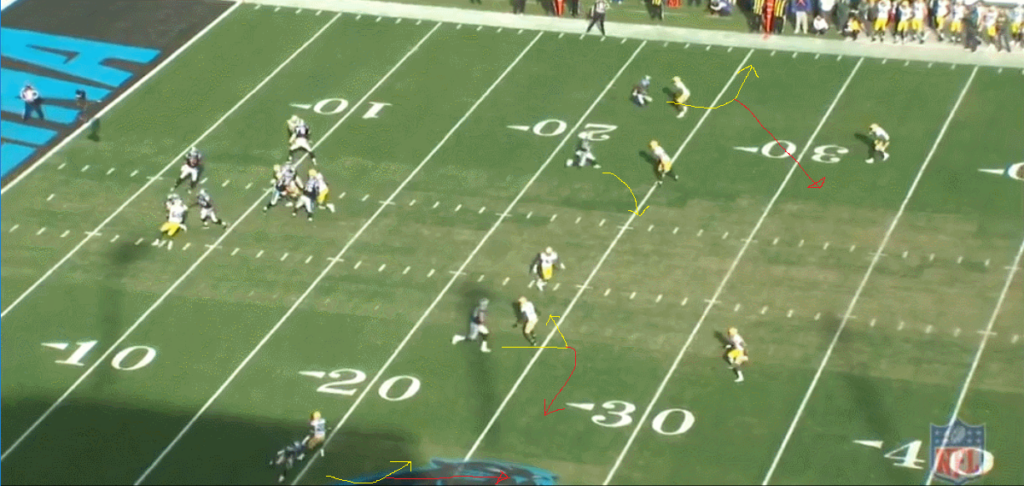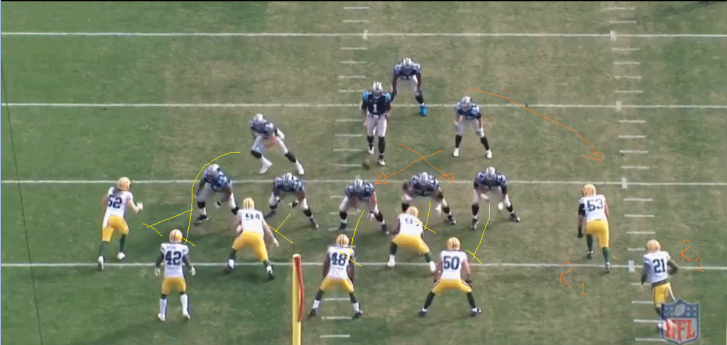 The one passing play where the Panthers were unsuccesful in trying to use McCaffrey was on a third-and-nine play inside their own twenty-yard line. Here they keep Dickson in as an extra blocker against the Packers’ drop back zone: