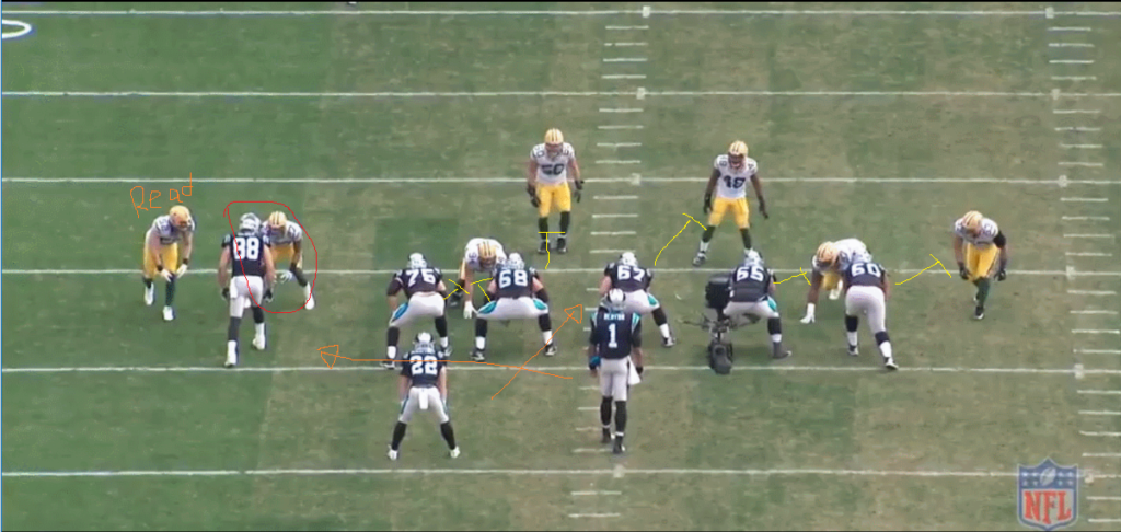 The above image shows the defensive alignment pre-snap, with the read defender being the safety highlighted by the red circle. As the safety is lined up inside the tackle box, Newton could have optioned to the jet sweep, looking to take advantage of the speed mismatch against the safety. While Olsen’s missed block and good play by Blake Martinez (#50) led to this run being snuffed, the Panthers need to further improve how they use these pre-snap options if they want to get the most out of plays like this.
