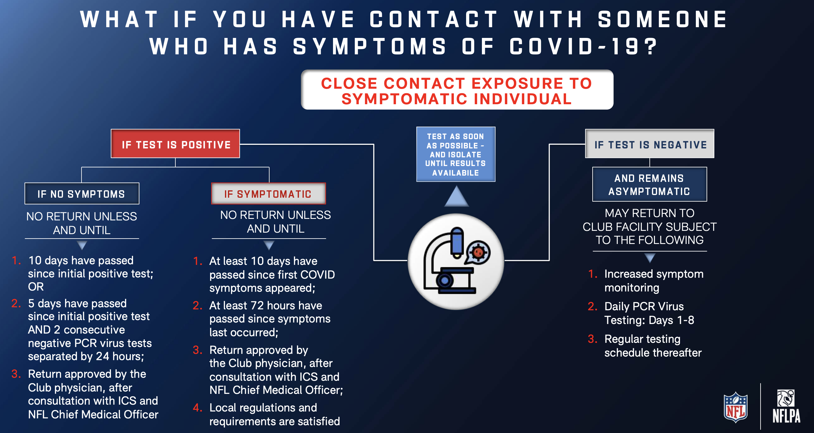 Close contact is defined by the NFL as being within six feet for ‘about ten minutes’, direct contact with secretions from a sick person with COVID-19, direct physical contact with an infected individual during practice, game or team travel or handling uniforms, equipment or a shared object used by an infected individual.