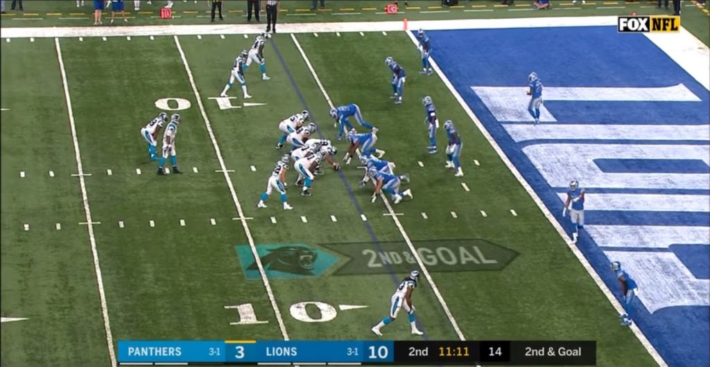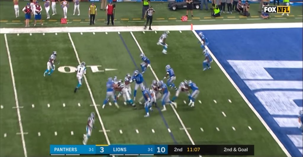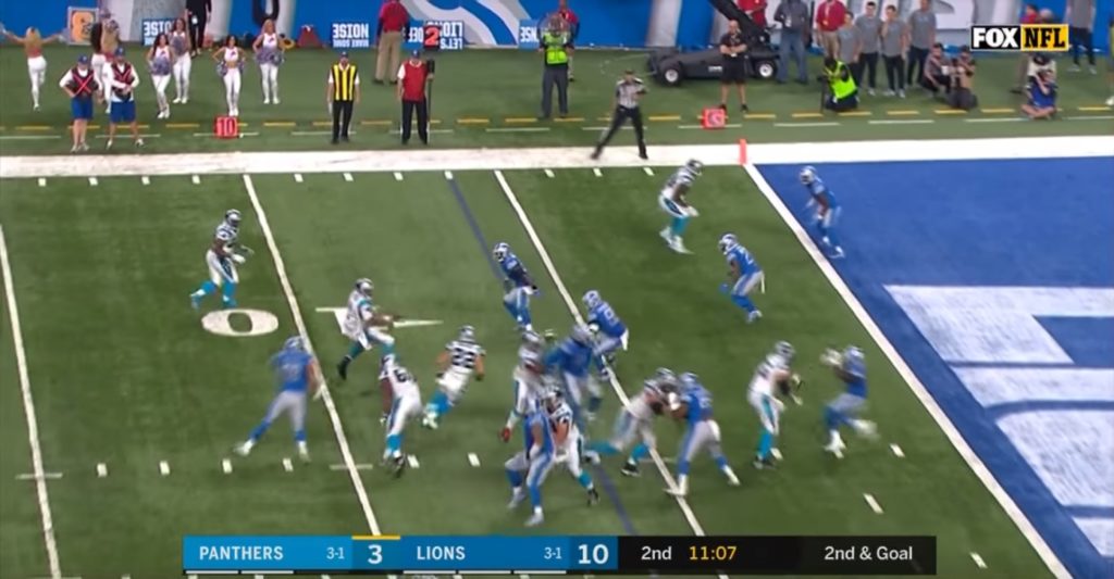 Almost every play in the NFL involves reads, which can largely be classified as pre-snap or post-snap. This play looks to have both, with the jet-option being a pre-snap determination by Newton based upon the defensive formation. As mentioned earlier, the Lions formation is effectively one with two ‘high’ safeties. This means that they are able to defend the boundaries reasonably effectively, and so any jet sweep to the near side would run the risk of being cut-off by the near-side safety. Had the Lions adopted a 4-2-5 look, with only one high safety and seven defenders in the box, this might well have been a simple jet sweep with Samuel being trusted to win a leg race with the near-side box defender.
