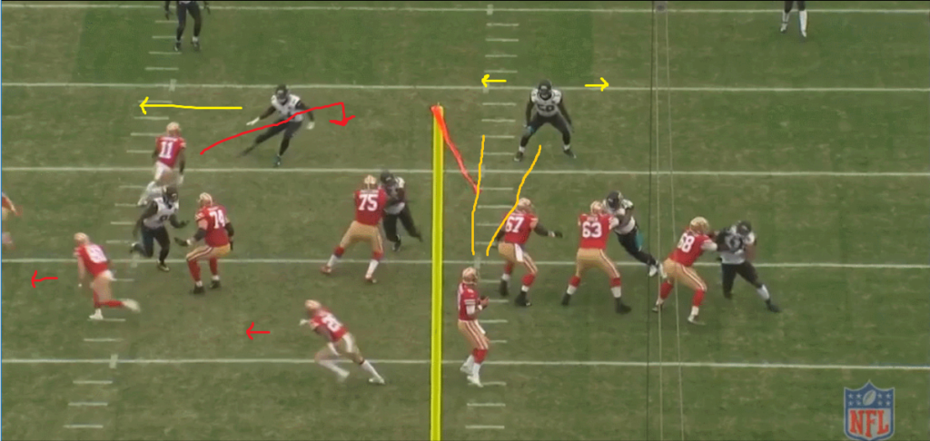 The above diagram shows the read from the quarterback’s point of view, with the two backfield receivers forcing Jack (#44) outside. This leaves the quarterback to read Telvin Smith (#50); if Smith dives outside to help inside on the slant, then Garropolo can drop the ball off to the sit-down receiver and if not, as happens, he hits the slant for a first down.