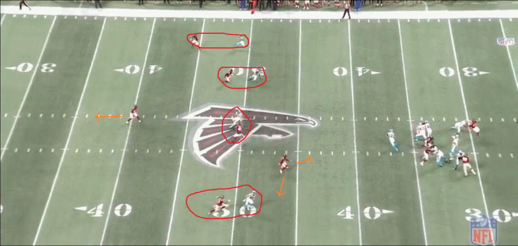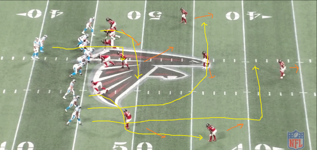 On the following play, the Panthers run a similar concept, with an unbalanced formation and the Falcons playing deep. However, in contrast to the 49ers play above, the Panthers fail to take full advantage of the width of the pitch, with all underneath routes focused on the near side of the field.