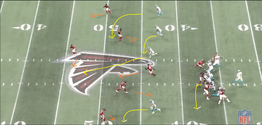 As the Falcons know that they can give up receptions short of the yard marker, they are able to wait for the receivers at the heads of their routes and easily prevent the completion. What’s more, by running all the players to this level, the Falcons can drop all defenders to this point, thereby narrowing the windows Newton has to make his throws. The single underneath defender is then able to read Newton to either come down to McCaffrey if he drops the ball off or to help up the field, if necessary.