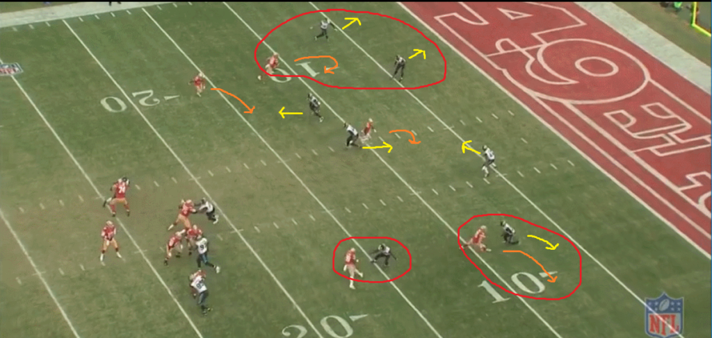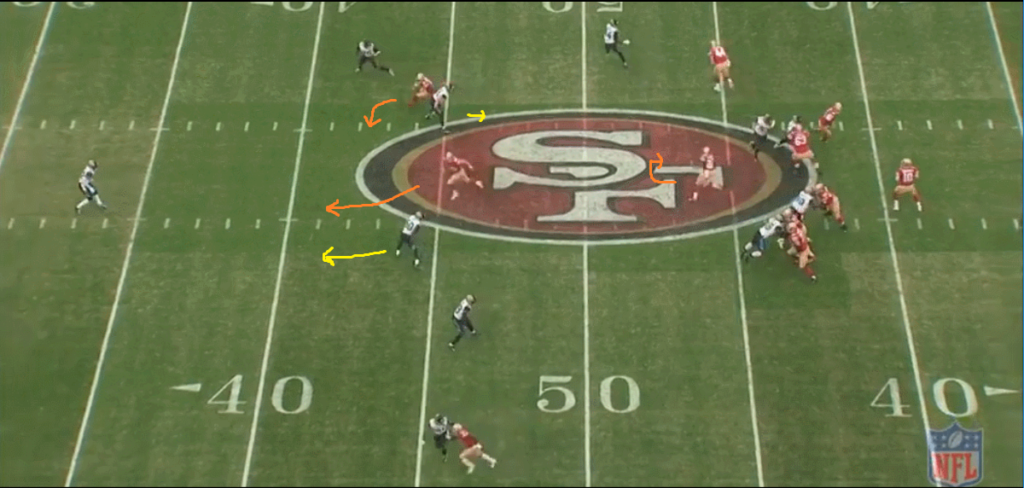 Again, the 49ers are able to stretch the defense both vertically and horizontally using the other three receivers, and with the drag breaking inside this creates what is effectively a two-on-one read, with the quarterback simply reading the linebacker as shown: