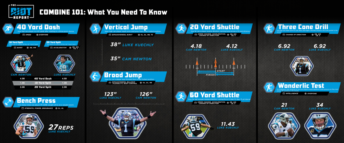 Everyone knows that the 40-yard dash is an easily translatable drill to the NFL: how fast a wide receiver can run 40 yards down the field is easy to quantify for fans, you can see the speed of a prospect and ostensibly, a 4.3 wide receiver will be able to outrun a 4.5 cornerback. That’s easy. But what does the three-cone drill show you about a player? Does the vertical jump actually matter the most for offensive linemen? What position should you be keeping an eye on in the 20-yard shuttle? Let’s take a look at the main drills most players will be completing in an attempt to show their best side to potential employers this week in Indy: