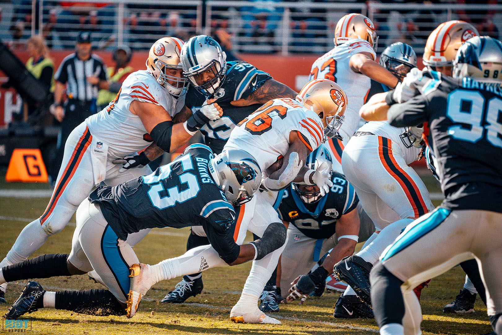 After undergoing a bye week procedure on his right wrist, injured in Week Four against the Houston Texans, the Panthers’ first-round draft pick and exciting rookie pass rusher was forced to play with his hand wrapped in a cast in Week 8’s matchup with the 49ers. And in turn, Burns’ impact on the game was muted: between the club on his hand and the lack of pass rushing opportunities in general, he would play only 33% of Carolina’s 67 snaps on defense.