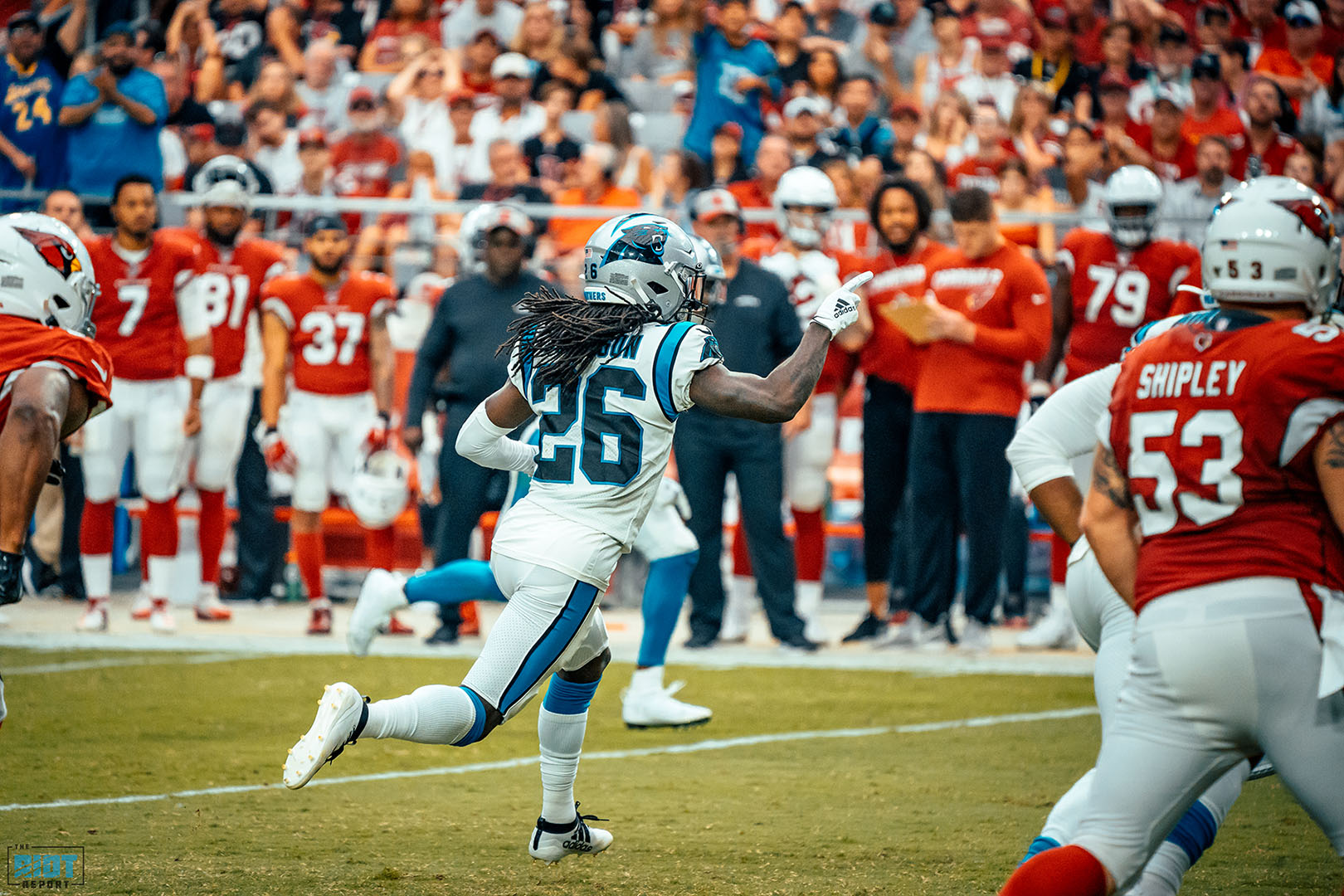 The defense held the Cardinals to less than four yards per offensive play – the Cardinals fast-paced, no-huddle offense kept the Panthers off-balance early but once they got used to the pace of it, they were able to keep the Arizona receivers in front of them and when Murray couldn’t find a place to go with the football, the pass rushers pounced.