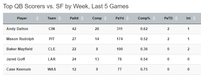 QBs facing the 49ers are averaging 155.7 yards per game. That’s by far the lowest mark this year, and they’ve also allowed the fewest attempts and completions while racking up the sixth-most QB sacks with 20.