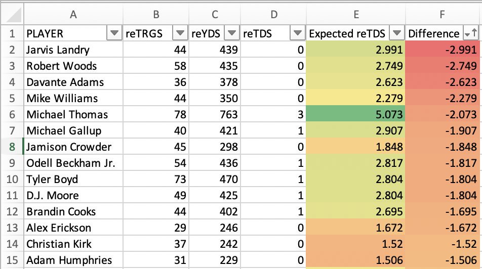 What this chart tells us is that based on his opportunity so far, Moore should have scored 2.8 TDs. The fact that he’s only scored one means that, if he maintains his rate of opportunity, these scoring numbers should eventually bounce back.