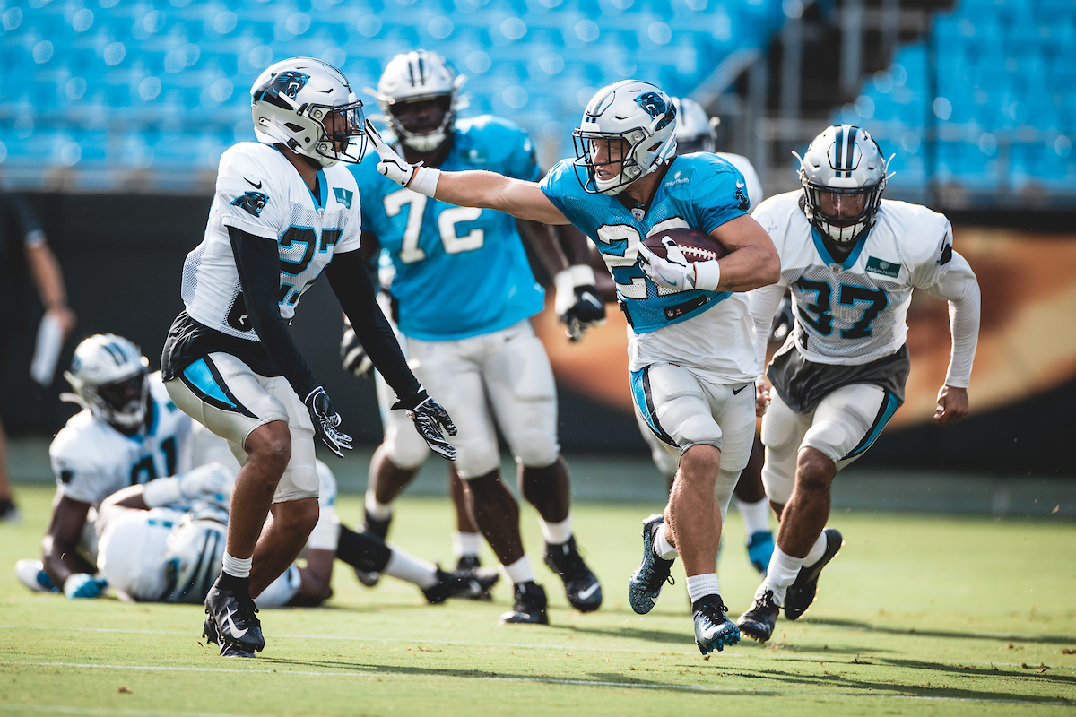Running Back Christian McCaffrey (22) stiff-arms defensive back Kenny Robinson (27) during team scrimmage at Training Camp on Saturday, August 22, 2020. (Photo by. Brandon Todd via Carolina Panthers)