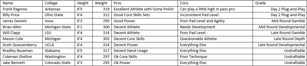 Frank Ragnow and Billy Price are the two standout players in this class; while neither are perfect players in their current states, both could be good developmental options for the Panthers on the second day of the draft. Ragnow is probably the better athlete and so possibly the more tempting prospect, with his ability in space being a particular bright spot; both could offer relief in a backup role if Kalil were to miss time in his final season. Daniels has been talked about a lot in the same breath as the first two but while his raw power is excellent, he struggles with his lateral agility and play height at times and could be a significant project for whoever drafts him.