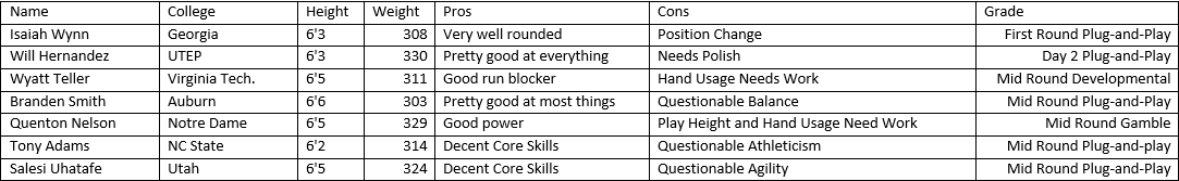 Teller and Nelson both offer good upside as prospects, but both will need some work to fulfill their potential. Both suffer from inconsistent hand usage, something that will get found out and exposed by the better defenders in the NFL. Nelson also needs to show a more consistent pad level, as he did play quite high at times in college, something that will make him susceptible to power moves in the NFL. Smith, Adams and Uhatafe are all fairly well rounded prospects but will likely be mediocre starters in the NFL; for the Panthers, these only really fill a need in that they could offer depth behind the starters or a emergency stopgap should they lose Norwell and fail to address this area in the first couple of days of the draft.