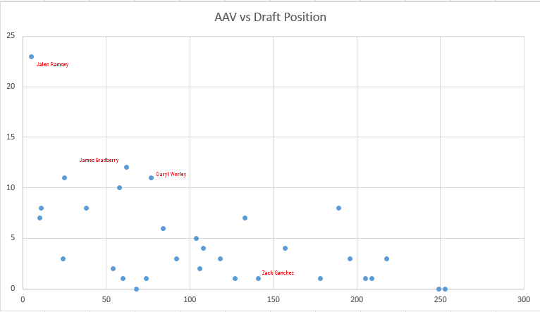 All this results in a high level of unpredictability when it comes to drafting cornerbacks. The following graph shows this for 2016, with the y-axis showing approximate value (via PFR) and the x-axis shows draft position. While the first corner taken (Jalen Ramsey) has been the most valuable and there is something of a downwards trend as the draft goes on, there is a considerable degree of noise on this graph.