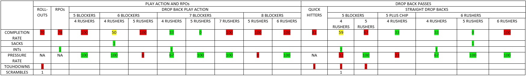 Areas where the Panthers held teams to a completion rate of under 50% are highlighted in green, as are areas where the Panthers had a pressure rate of over 50%. Similarly, areas where the Panthers allowed a completion rate of over 60% are highlighted in red, as are areas where their pressure rate was below 50%. Areas where they allowed a completion rate between 50-60% or where their pressure rate was exactly 50% are highlighted in yellow. Now for the Cincinnati and Atlanta games: