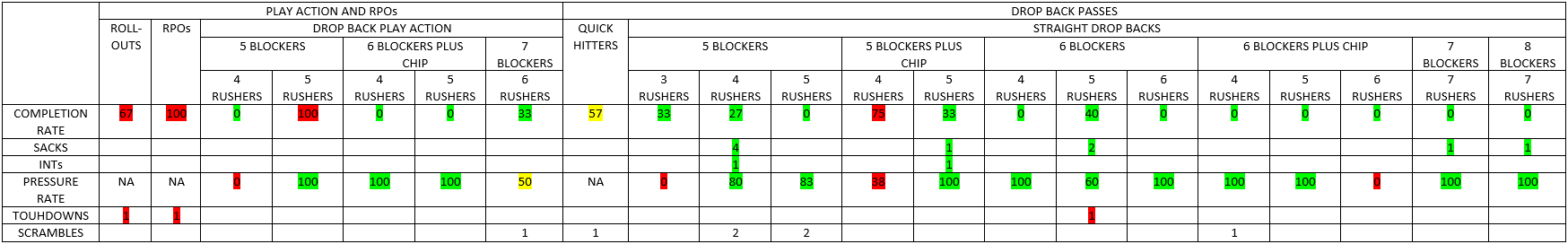 The key to data drive analytics is, well…data; so before going into the tape in detail, it is worth looking at the numbers that make up the Panthers pass defense – and pass rush in particular – during these four games. In order to compare the performance in the games where things went well and the games where they went badly, the two data sets are presented separately. First, the data for the Tampa Bay and Dallas games: