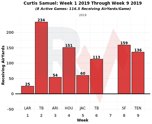 Samuel’s now cracked 100 air yards in five of eight games this year.