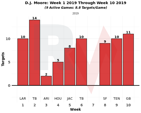 There was a bit a dip when Kyle Allen first took over at QB, but Moore has resumed his role as one of the most reliable volume accumulators in the league.