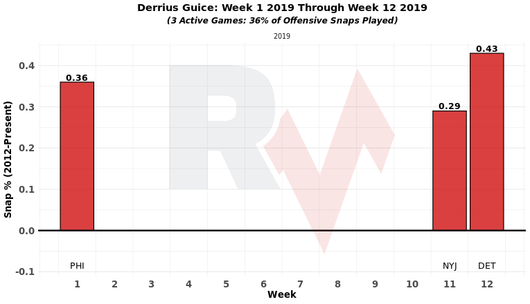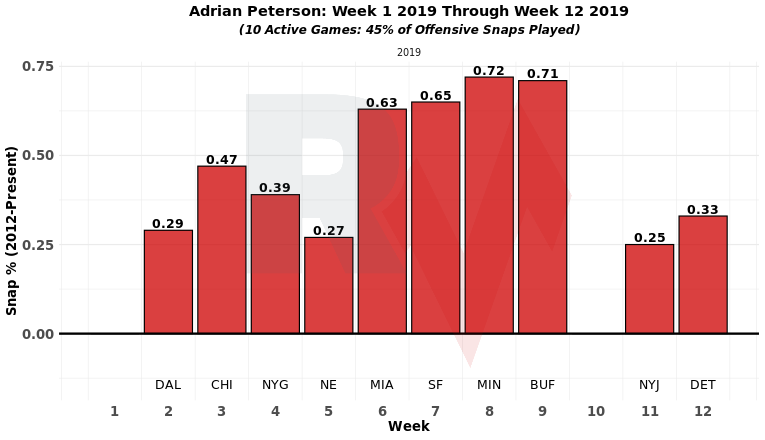 Meanwhile, Guice is the mover in this backfield. While both he and Adrian Peterson had ten carries last week, Guice hit a career-high snap rate of 43% against the Lions. That extra playing time is coming at the expense of Peterson, who was on the field for just 33% of the plays.