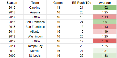 Panthers fans might want to go on and skip ahead to the DFS section because this part won’t be pretty. Carolina is fielding a historically bad run defense, particularly in the TD department. They’re given up 1.62 RB rushing TDs per game, the worst mark of any team over the past decade, and it’s not particularly close.
