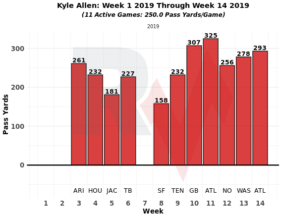 Over the last five games, Allen put up more pass attempts (43.2/game) than any QB not named Dak Prescott. He’s averaged 291.8 passing yards per game in that stretch; that’s fourth-most, an impressive feat, considering his 6.8 yards per attempt ranks just 20th.
