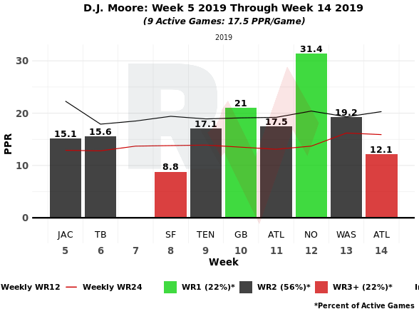 - The market has caught up to D.J. Moore’s exploits of late, but at $6,600 on DraftKings he’s still a screaming value and priced cheaper than Tyler Lockett, who’s averaged 4.8 fantasy points per game over the last month. Moore should see plenty of Trey Flowers, Seattle’s weakest cornerback. He’s got a nice floor for cash games and plenty of ceiling for GPPs.