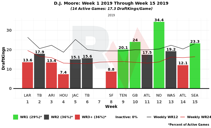 - We’re suddenly in an awkward position with D.J. Moore. As the seventh-most expensive WR on DraftKings this week ($6,900), he’s finally being priced properly. However, his once-safe floor is now something of an unknown with Grier under center. While I don’t like him in cash games this week, he still has plenty of upside for GPPs.