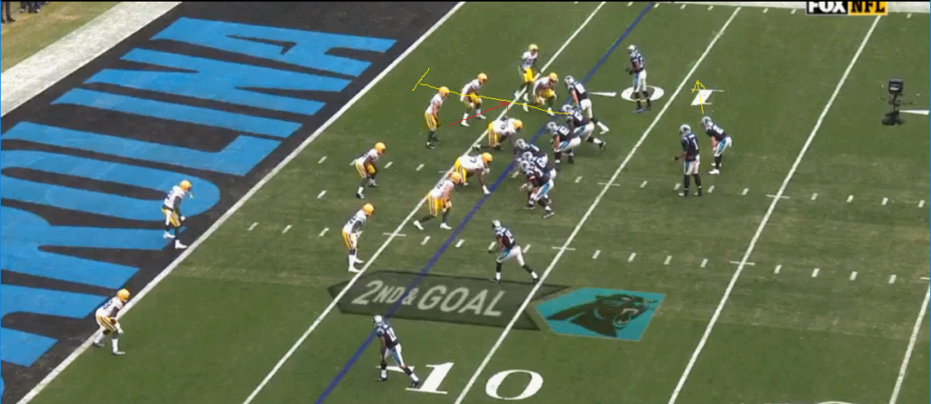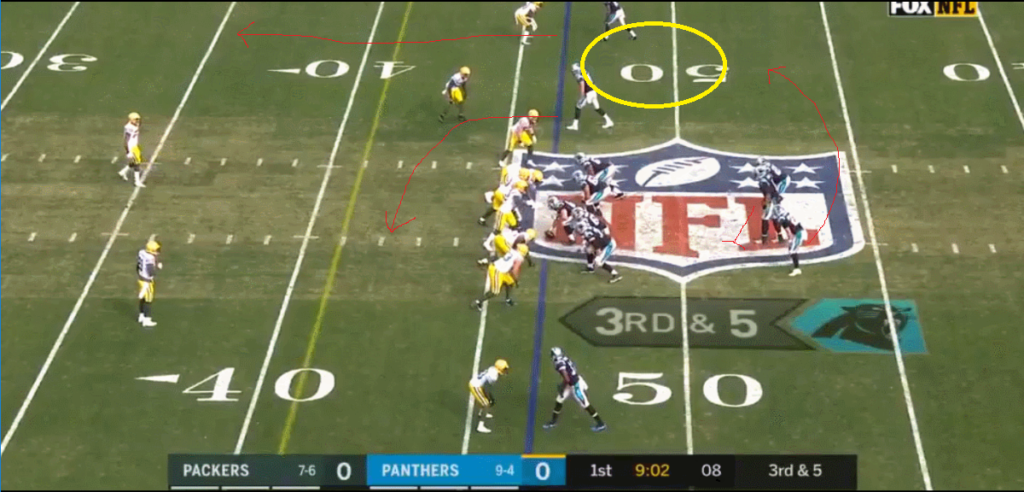 Whether Clay Mathews was bluffing about the wheel route or he really did try and alert the defense to that play is impossible to know, but when the Panthers run plays that involve McCaffrey getting to the edge, it forces the defense to hold the outside.