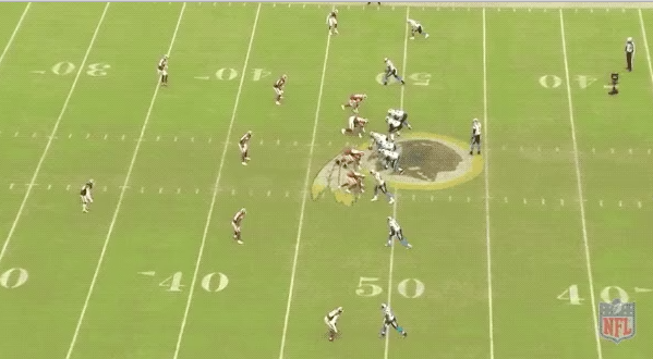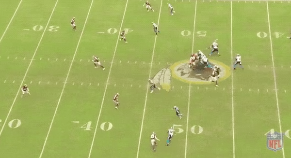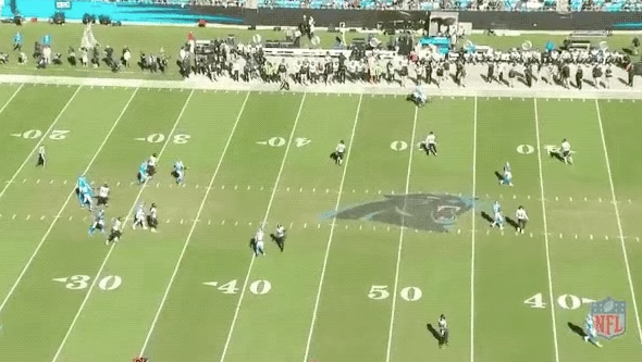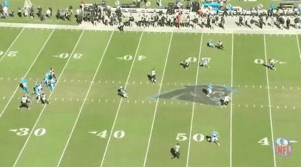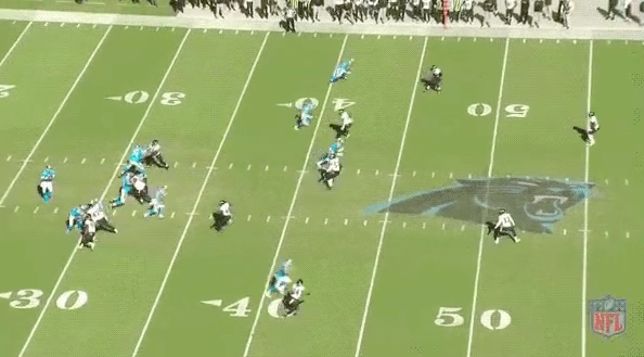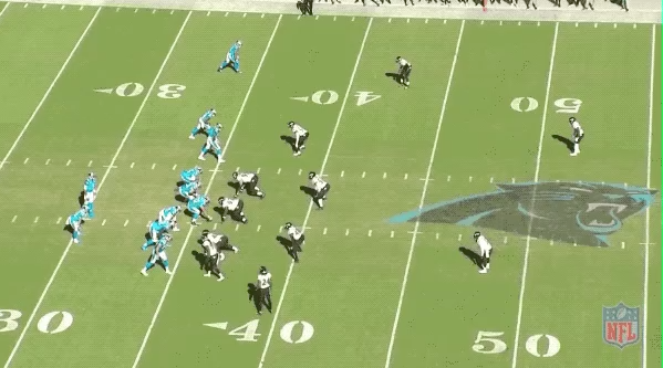 As the heavy misdirection draws the middle of the defense to the left side of the field, that leaves the middle completely open. Moore wisely finds a soft spot, stays there, and allows Newton to give him the ball, allowing him to, again, get loads of yards after the catch.