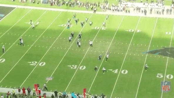Unfortunately, Newton’s pass is under thrown, so the ball is disrupted and lands on the turf for an incompletion.