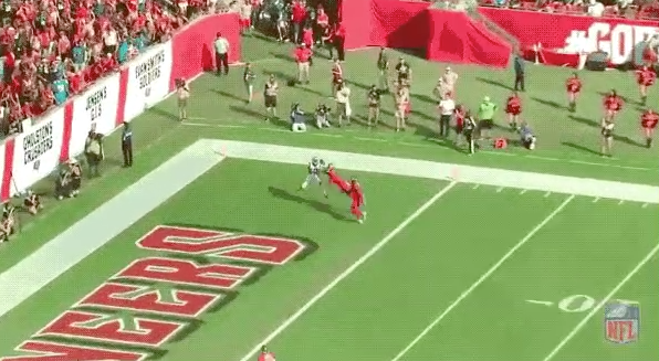 Newton fires high enough that only Samuel has a chance at this pass, and Samuel makes a nice high catch to bring in the score.